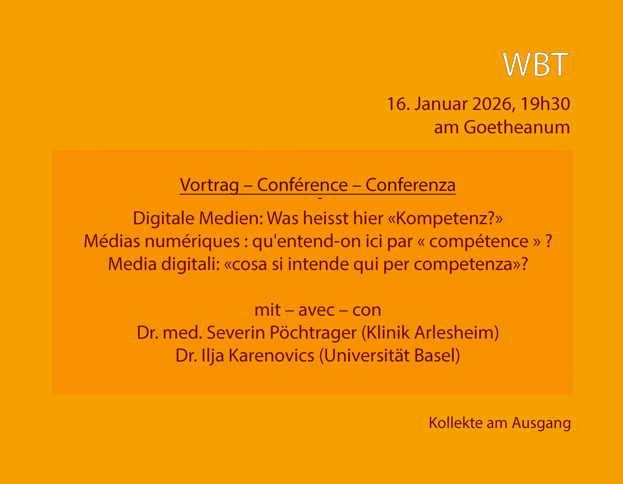 À l'occasion des Journées suisses de formation continue (WBT), une conférence publique sera donnée le 16 janvier à 19h30 par le Dr Severin Pöchtrager (clinique d'Arlesheim) et le Dr Ilja Karenovics (Université de Bâle) sur le thème : « Médias numériques : qu'entend-on ici par compétence ? ».
