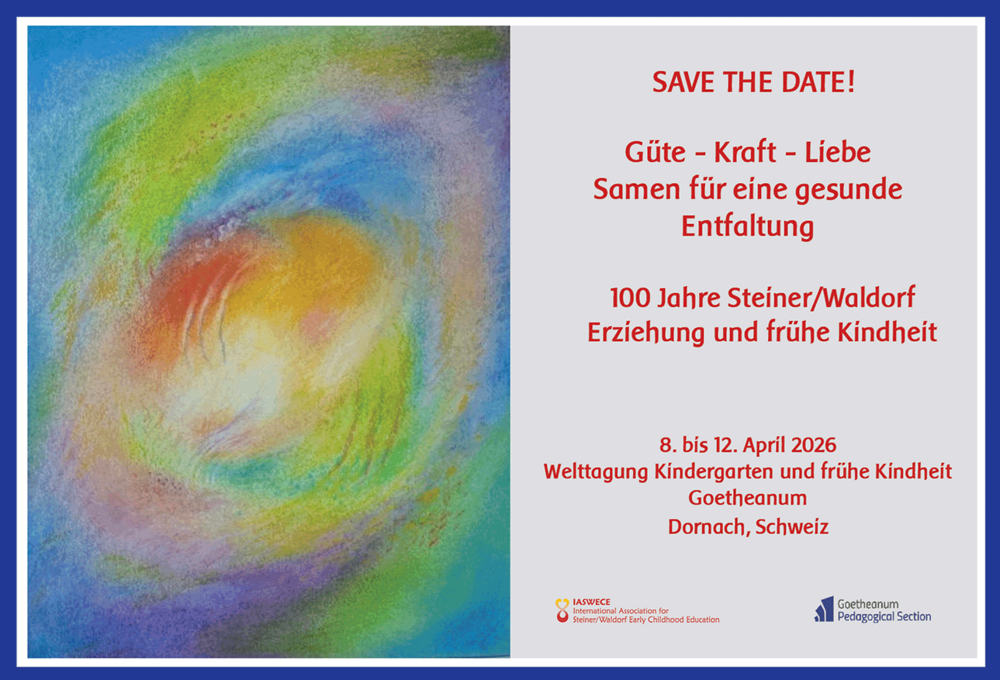 Liebe Kolleginnen und Kollegen, die mit dem kleinen Kind zwischen der Geburt und dem 7. Lebensjahr arbeiten. Sie sind alle ganz herzlich zur Welttagung der IASWECE und der Pädagogischen Sektion eingeladen, die vom 8. bis 12. April 2026 am Goetheanum stattfinden wird. Das Thema lautet: «Güte – Kraft – Liebe. Samen für eine gesunde Entfaltung». Seien Sie dabei!